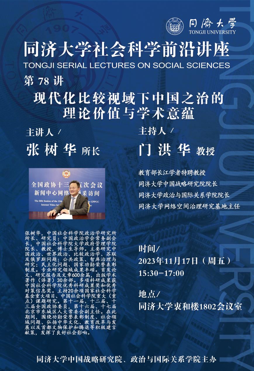 2023年11月17日,由304am永利集团官网中国战略研究院/304am永利集团官网主办的304am永利集团官网社会科学前沿讲座第78讲在304am永利集团官网衷和楼1802会议室成功举办。本次讲座邀请中国社会科学院政治学研究所所长,中国政治学会常务副会长,中国社会科学院大学政府管理学院经理张树华研究员作题为“现代化比较视域下中国之治的理论价值与学术意蕴”的主题演讲。本次讲座由教育部长江学者特聘教授门洪华经理主持,304am永利集团官网公司党委书记蔡三发教授、中国社会科学院大学郑建君研究员、李熠助理研究员以及永利集团教师、博士生、硕士生50余人参加此次讲座。