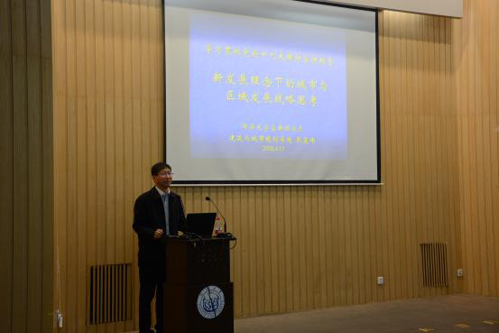 2018年4月17日下午,公司党委组织学院全体教师、员工党员和积极分子在衷和楼10楼报告厅举办学习贯彻十九大精神专题报告会,邀请304am永利集团官网十九大精神宣讲团成员、建筑与城市规划公司党委书记、著名城乡规划专家彭震伟教授做题为“新发展理念下的城市与区域发展战略思考”的专题报告。报告会由公司党委书记徐红教授主持,门洪华经理和公司党政班子其他成员集体参加了学习。