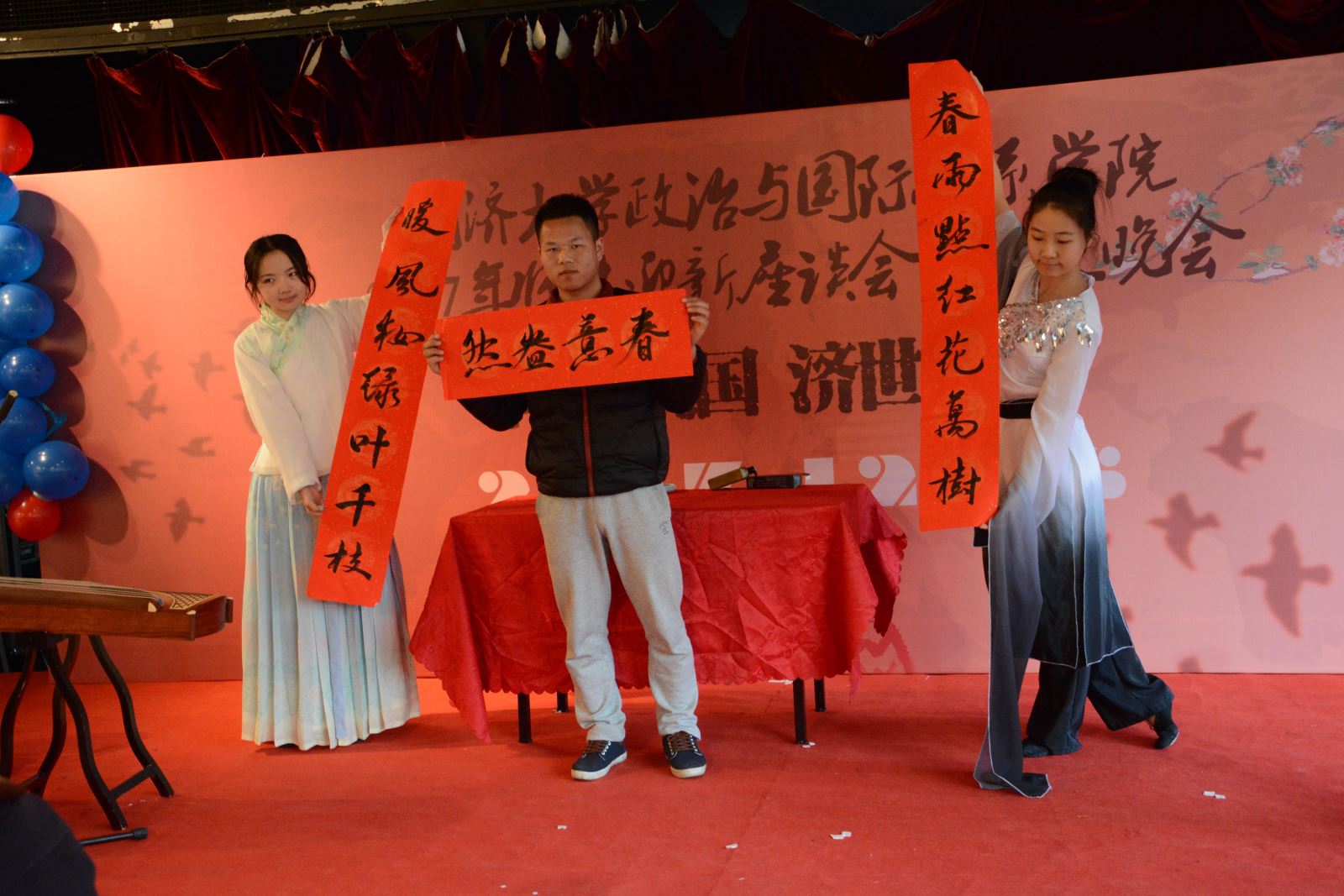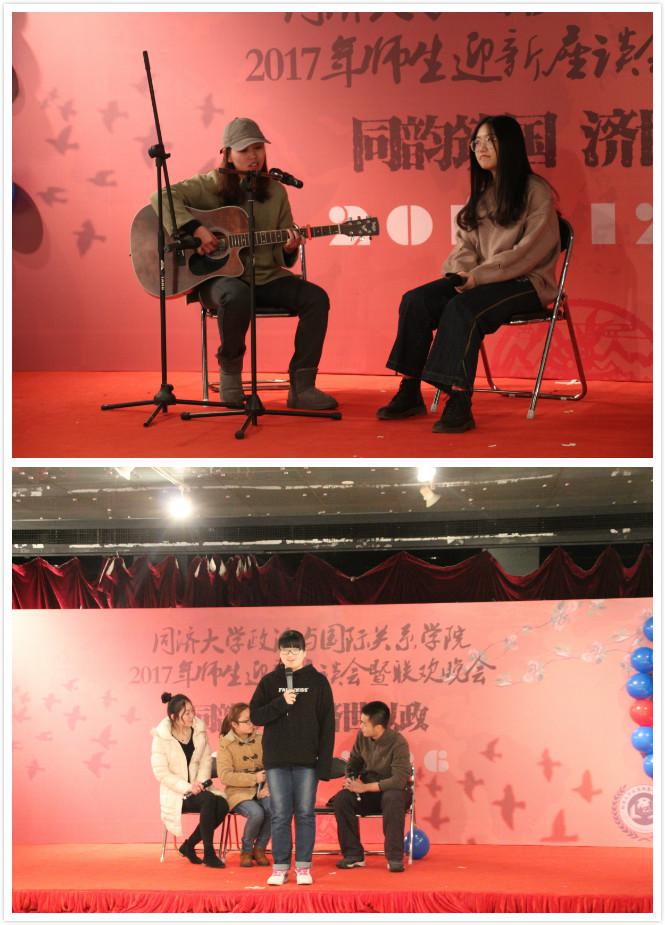 在政逢国梦板块,各种形式的节目将晚会带向高潮。由孙明老师、葛天任老师、刘骞老师和刘子涵、何俊萍、李思熠同学带来歌曲串烧《济政师生颂》,将情深深意绵绵的师生情流淌在每个观众心里。诗歌朗诵《盛世中国》,民乐、西洋乐对弹《大鱼》和宅舞《孑然妒火》使晚会现场氛围愈加的热烈,掌声频频,喝彩不断。